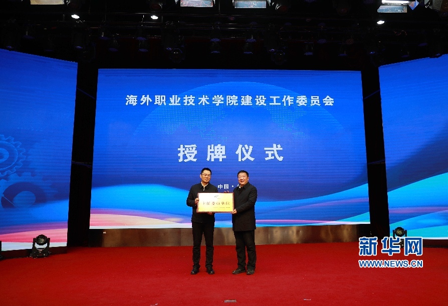 中国海外职业技术学院建设工作委员会成立仪式,与会领导为主任单位、副主任单位授牌。新华网发 (张晓琪 摄)