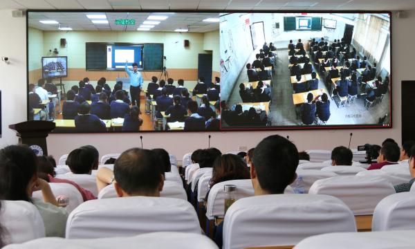 两堂公开课均以我司的智慧校园IS平台为支撑,采取“三课联动”即录播课堂、互动课堂、观摩课堂三个空间、三方主体同步参与的形式,由授课老师带领一个班级在录播课堂上课,另一个班级在互动课堂同步参与,听课老师在202教室通过大屏幕的实时转播画面和声音同步观摩课堂。通过信息技术,传统课堂的空间壁垒被消解于无形,一个老师可以同步驾驭多个课堂成为现实,优质教育资源实现了更广泛的共享。
