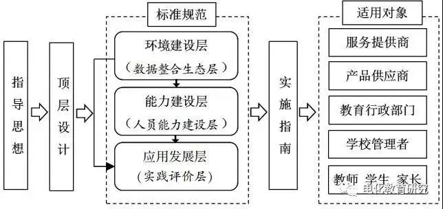 标准规范先行建设是国际上开展信息化工作的共同经验,我国教育部于2000年初就成立了“教育信息化技术标准委员会”,创建适用于我国国情的标准体系。随着移动互联网、大数据、传感器、神经科学、人工智能等新技术在教育中的渗透使用以及教育形态的重构和创新,标准体系的更新是应对上述变化的必要举措。在教育信息化2.0时代,需要建立的不仅仅是硬件环境、软件工具和开发标准,还应当围绕着谁来用、如何用、如何评等建立相应的规范与指南,例如信息化建设相关主体的能力标准、培训课程标准以及培训规范等。标准和规范建立的过程是对相关要素在教育信息化建设中角色、职能、定位以及关联影响的思考过程,一旦建立,将厘清其作用和发展路线、勾勒其影响和作用半径,使得系统中多主体之间的对标与合作成为可能,并最大化其协作效益。