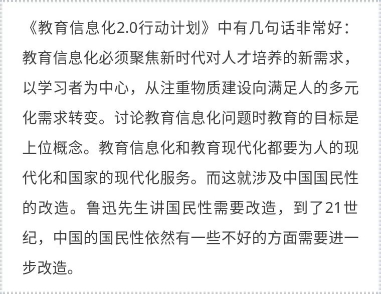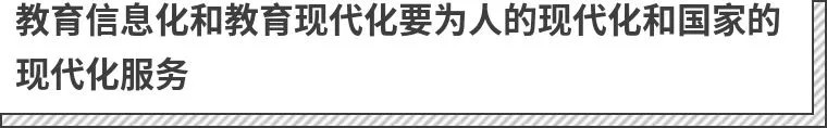 信息化只是一个手段,是为教育目标服务的。我们国家最大的目标是什么?我们的第二个百年目标是什么?是实现现代化。什么是现代化?教育怎样为实现现代化服务?教育作为一种手段要为两个方面服务:一方面是服务于人的发展,另一方面是服务于国家的发展。服务于人的发展就是培养现代人,服务于国家的发展就是建设真正的现代国家。教育信息化的核心是教育,教育信息化存在的合理性不取决于技术自身多么高超,而取决于它如何为教育服务。如果教育信息化为培养现代人、为建设现代国家服务的能力很差,那么这种教育信息化是非常值得怀疑的,它的价值取向是有问题的。