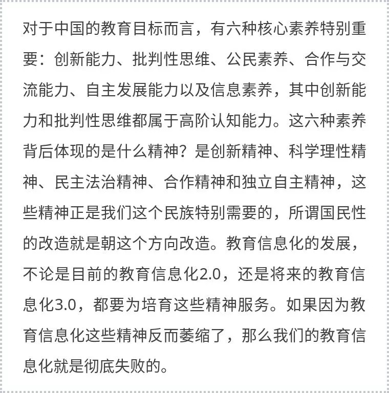 这六种核心素养可以进一步概括为两大超级素养:创新能力和合作能力。创新能力与智商相连,体现的是“聪明的脑”。创新是真聪明,会刷题、会记忆不是真聪明。合作能力与情商相连,体现的是“温暖的心”。中国孩子特别需要培养这两种能力。教育信息化的价值必须与教育目标紧密联系在一起。如果我们的教育信息化使得我们的孩子头脑更聪明了、心灵更温暖了,那么信息化的目标就达到了。现在我们国家教育存在的问题是什么?我们现在的培养目标,特别是在中小学,实际上只有两个:第一个是成绩要好,第二个是要听话。只要孩子能考高分而且听话,就是好孩子。这样的孩子其实未必能对国家发展做出很大的贡献。而有创新精神的孩子在教育体制内并不一定受欢迎,老师不一定喜欢。所以信息技术的使用应当让人变得更聪明、更温暖。哈佛大学的哈瑞·刘易斯教授写了一本书,书名叫《失去灵魂的卓越》,描述的是哈佛大学培养的一部分学生,学历很高,成就卓越,但是没有灵魂。我们需要反思一下:有没有“失去了灵魂的技术”?教育信息化和信息技术一定要有灵魂。现在有些学校采用信息化技术为应试服务、为控制教师服务,这样的信息化、这样的技术手段就用偏了。